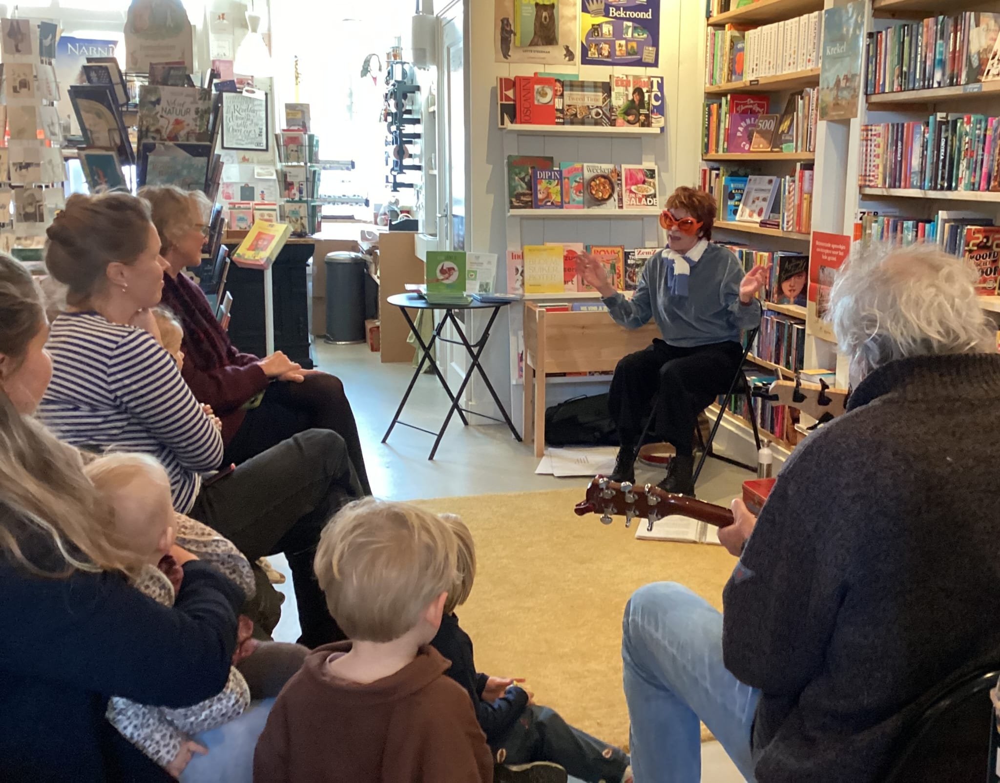 De voorleessessie in de Arnhemse kinderboekenwinkel was ook een groot feest. Wanda heeft "Klein Jantje is jarig" voorgelezen. Na het voorlezen was het tijd voor muziek met Stijn en Marcel. Alle kinderen, ouders en grootouders hebben uit volle borst meegezongen.
